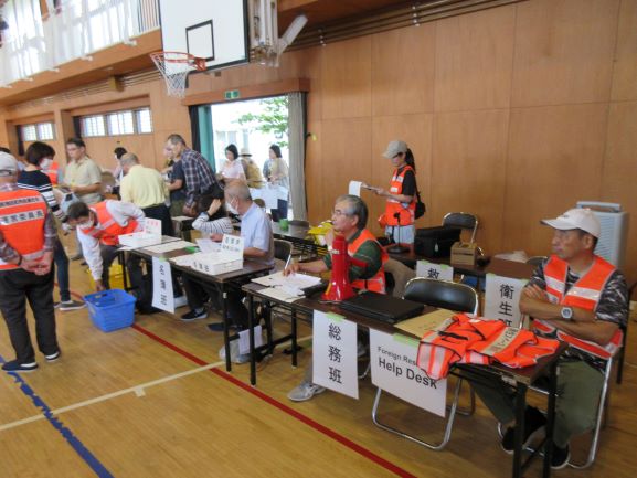午前8時20分に、各家庭でシェイクアウト訓練(まず低く、頭を守り、動かない)を行い、その後、通町小学校へ避難し、避難所開設・運営訓練を実施しました。その後、引き続きブースごとに分かれて訓練を行いました。