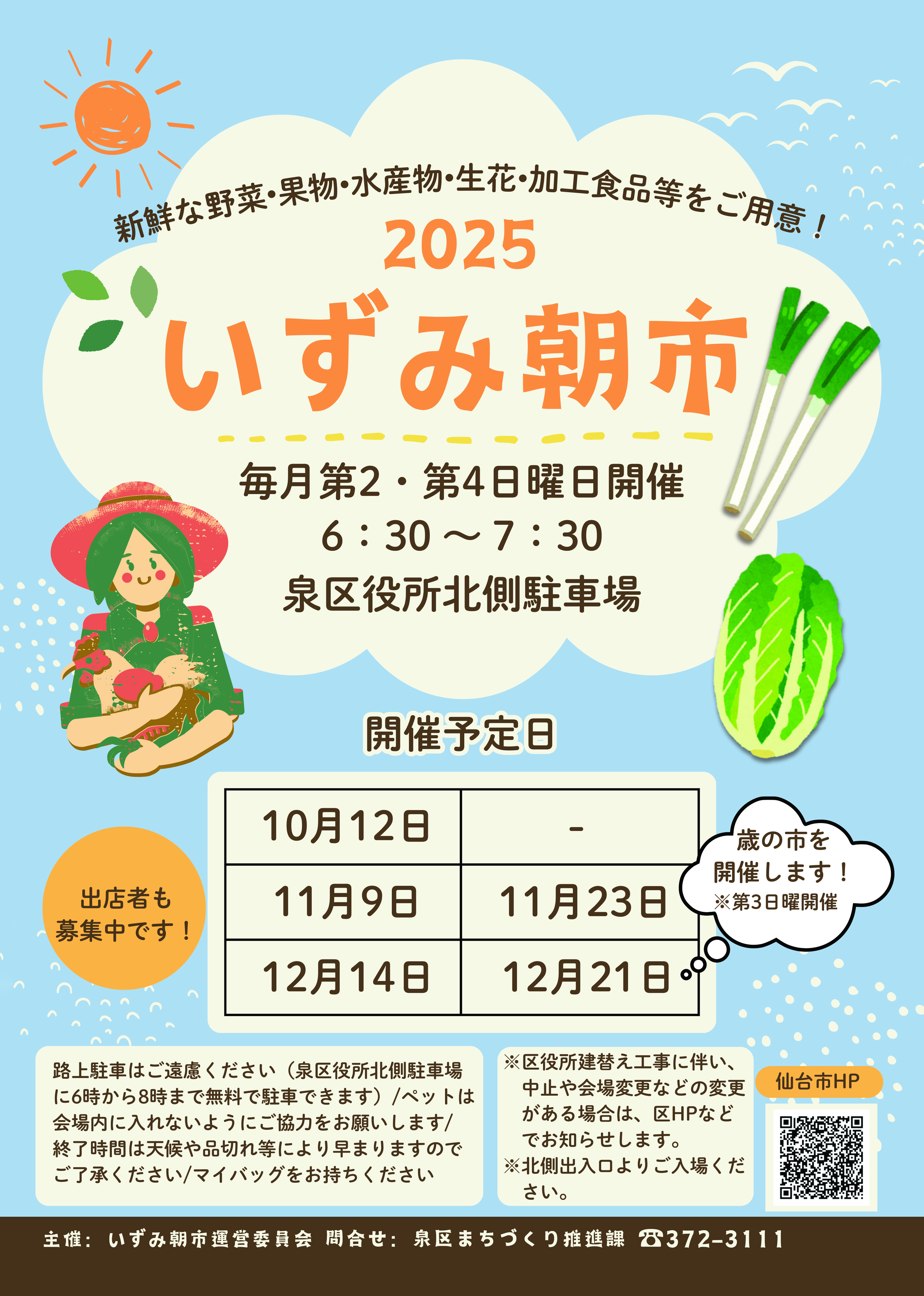 泉区では、地元の生産者と消費者の交流や地域振興を目的に、毎年4月から12月に「いずみ朝市」を開催しています。地元で生産した新鮮な野菜や果物と、その野菜を材料とした加工品などを生産者が直接販売します。ぜひ、ご来場ください。