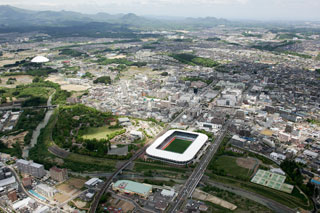 写真中央手前に見える白い長方形の建物がベガルタ仙台の本拠地であるユアテックスタジアム、写真左奥に見える白い丸がシェルコムせんだいの屋根です。