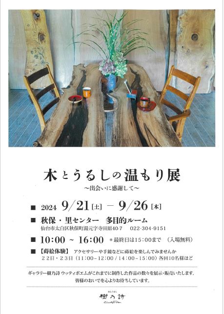 木とうるしのギャラリー「樹乃詩」がこれまでに制作した作品の数々を、展示・販売します。期間中は、ワークショップも行います。
