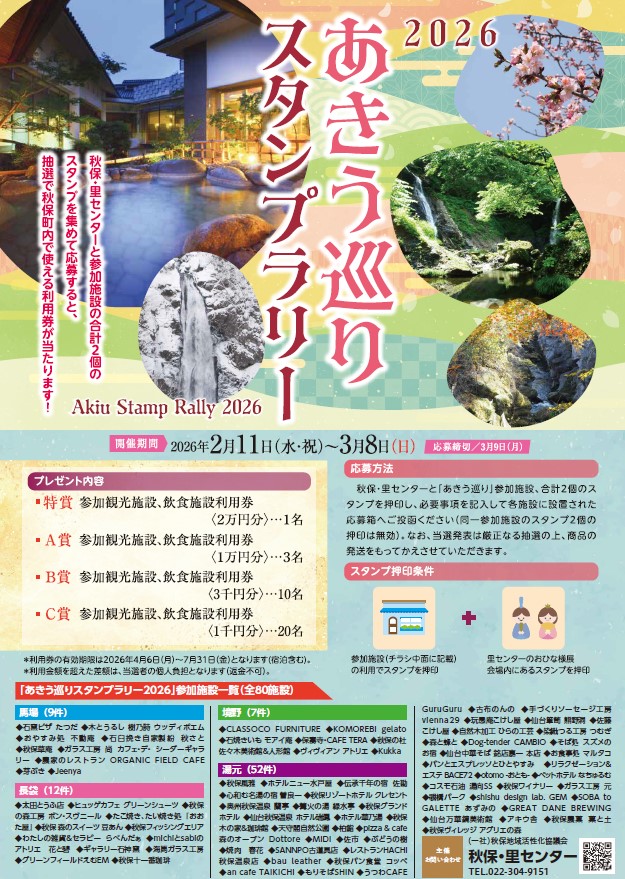 秋保・里センターと参加施設の合計2個のスタンプを集めて応募すると抽選で秋保町内で使える利用券が当たります!