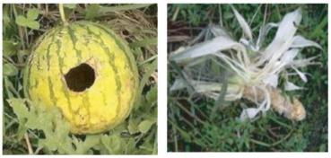 アライグマによる農作物被害の例(スイカ・トウモロコシ)