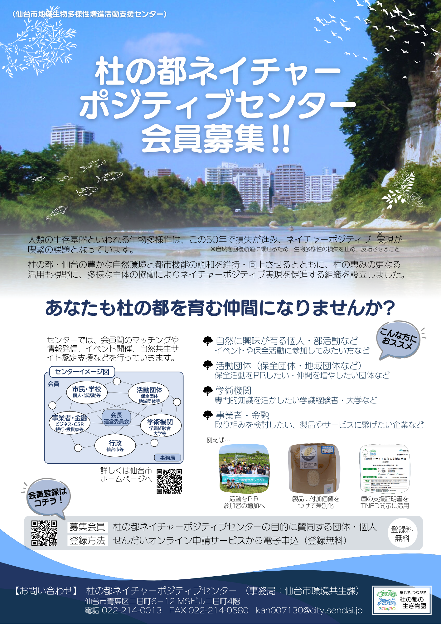 そのような状況の中、杜の都・仙台の豊かな自然環境と都市機能の調和を維持・向上させるとともに、杜の恵みの更なる活用も視野に、多様な主体の協働によりネイチャーポジティブ実現を促進する組織を設立しました。