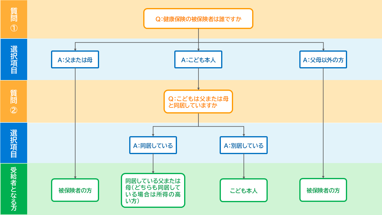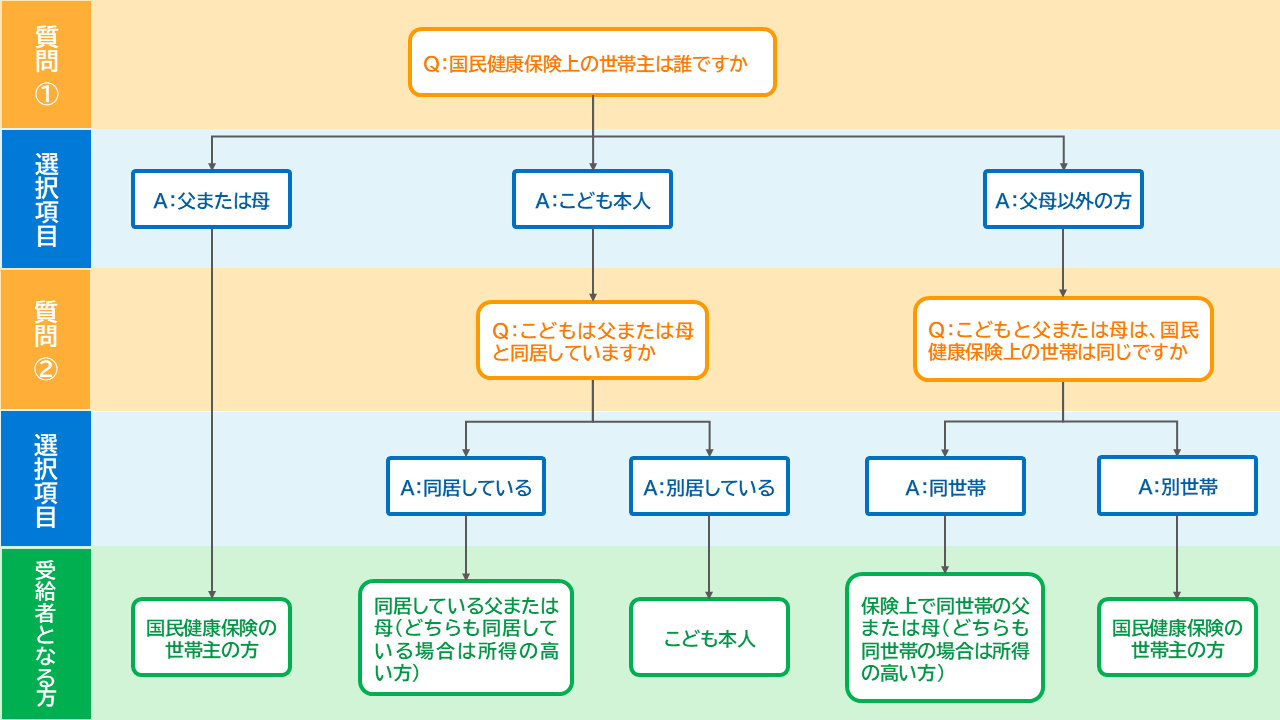 受給者となる方(申請する方)は、こどもの健康保険の加入状況などにより異なります。詳しくは『受給者となる方』をご確認ください。