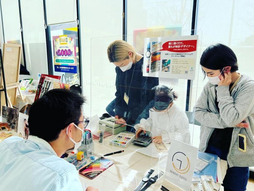 時計卸売業の株式会社後藤(青葉区)は、オリジナル時計の販売と腕時計をデザインするワークショップで出店。以前は卸売り専門だったが、補助金を活用してUVプリンターを導入しオリジナル商品の制作を始めた。デザイナーや福祉事業所とコラボした商品の販売や、家族写真などをアクリルパネルに転写し置時計にするサービスを展開している。