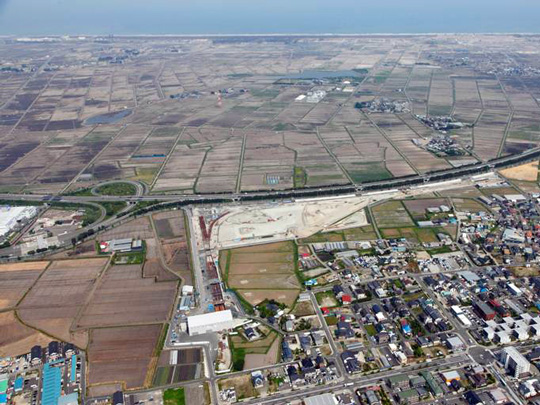 〈正在建设中的地铁东西线荒井车库附近。东西线计划2015年度内开业。照片左端为仙台东部道路仙台东出入口〉