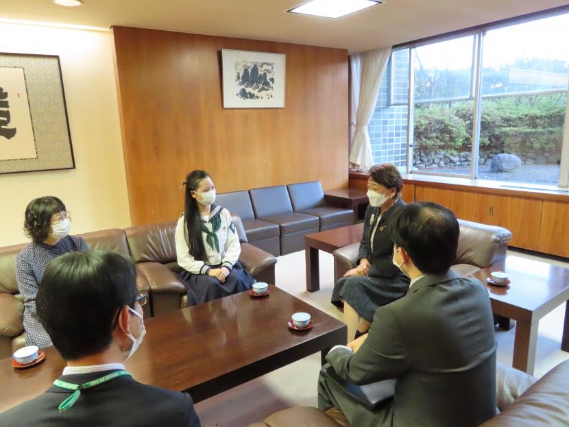 令和5年10月5日(木曜)、本市の音楽姉妹都市である大分県竹田市において10月13日(金曜)から15日(日曜)まで開催される「第77回瀧廉太郎記念全日本高等学校声楽コンクール」に本市代表として出場することとなった蛭田優莉亜さん(常盤木学園高等学校3年)が来訪し、郡市長を表敬訪問しました。