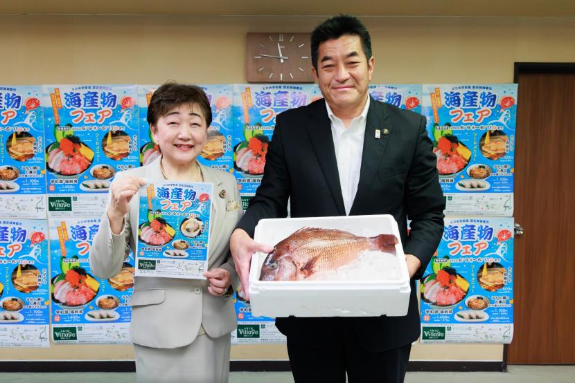 岡原市長は、秋保ヴィレッジで開催される宇和島市の物産フェア「えひめ宇和島 歴史姉妹都市海産物フェア」(6月9日(金曜)から6月11日(日曜)まで)にてトップセールスを行うために来仙し、フェアについてのPRを行いました。
