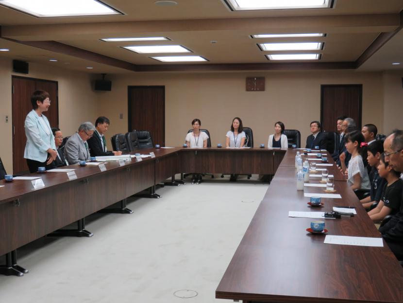 平成28年7月15日(金曜)、歴史姉妹都市・北海道白老町の白老小学校の児童4名をはじめとする訪問団が来庁し、市長を表敬訪問しました。白老小学校は、昭和53年10月に仙台市の片平丁小学校と姉妹校提携を結んで以来、隔年で相互に訪問するなど交流を続けてきました。今年は7月13日(水曜)から15日(金曜)までの3日間、白老小学校訪問団が仙台に滞在し、うみの杜水族館を見学したほか、片平丁小学校においてふれあいまつりや交流学級に参加するなどの交流活動を行いました。