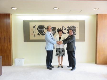 記念撮影(左から首藤市長、郡市長、日小田議長)