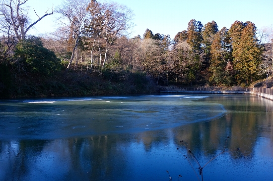 仙台市博物館付近の五色沼には薄氷が張っていました。