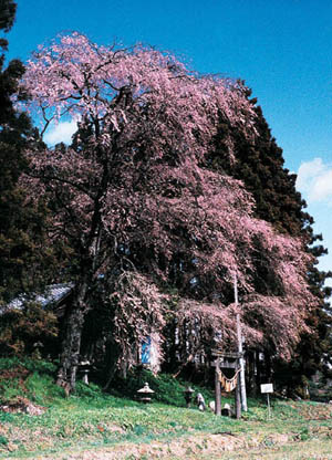 境内入口には、石鳥居の3倍以上も高いと言われるシダレザクラの古木があり、鳥居を覆うように濃いピンクの花を咲かせます。満開時には、長く垂れた枝の花が春風にゆれ、趣のある美しい風情を見せます。