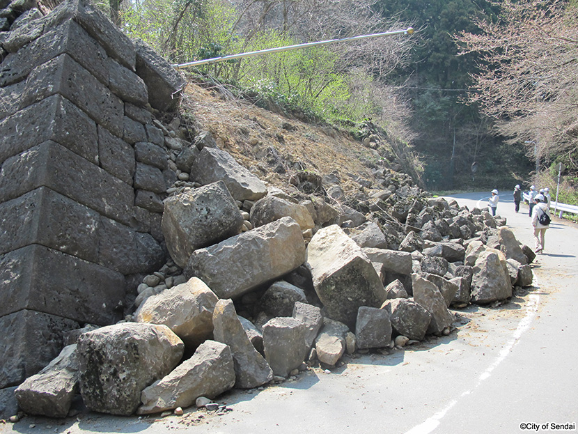 ホーム > 市政情報 > ともに、前へ 仙台 ―東日本大震災に関する情報― > 東日本大震災の被害・記録 > フォトアーカイブ 東日本大震災―仙台復興のキセキ > 被害状況 > 被害状況 内陸部 > 崩れ落ちた仙台城址の石垣