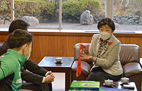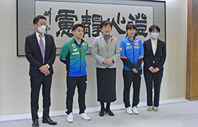 卓球ノジマTリーグ「木下マイスター東京」所属の及川瑞基選手と、「木下アビエル神奈川」に所属の張本美和選手が、宮城野体育館で開催される試合への出場に当たり、お見えになりました。トップ選手が集う試合が仙台で行われることを楽しみにしています。ぜひ、地元仙台・宮城で、思う存分力を発揮していただき、多くの観客を湧かせましょう!