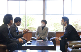 株式会社ウエストエネルギーソリューション 池田祐一営業企画部長と江口英喜東北営業本部・営業統括部長がお見えになり、企業版ふるさと納税による寄付金を贈呈いただきました。このたびの寄付は、市外企業とのマッチング支援を行う、株式会社七十七銀行の協力により実現しました。寄付金は、次世代放射光施設関連産業振興事業に活用させていただきます。