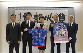 7月14日にユアテックスタジアム仙台でサッカー日本女子代表(なでしこジャパン)とパナマ女子代表との国際親善試合を開催するにあたり、公益財団法人日本サッカー協会の佐々木則夫女子委員長と、なでしこジャパンの池田太監督がお見えになりました。ワールドカップ前の大事な試合を仙台で開催できることをうれしく思いますし、勝利をつかみ取り、大きな弾みをつけてワールドカップに臨めるよう応援しております。