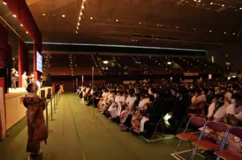 恩師からのメッセージ映像を放映しました。また、運営スタッフによる企画で、はたちの集い参加者の皆様と「旅立ちの日に」の合唱を行いました。