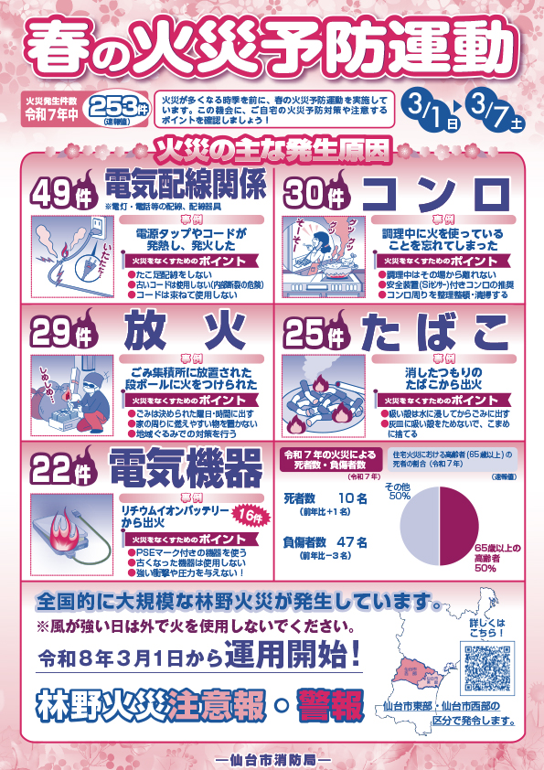 春は空気が乾燥し、火災が多く発生する季節です。ひとたび火災が発生すると延焼しやすいため、こんろや暖房器具の取り扱い、たばこの始末などに十分注意しましょう。