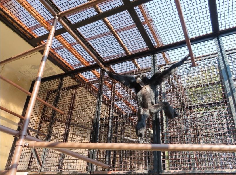 「ふれあいの丘」から東園に向かうスロープを下っていくと、左手にフクロテナガザルが見えてきます。