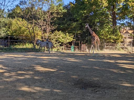 キリンの「エミリー」は、放飼場への通路慣らし、電柵慣らしを終えて、シマウマたちとの同居の慣らしに入りました。